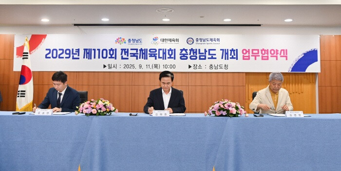 The signing ceremony, held on September 11 at the provincial government office, was attended by Governor Kim Tae-heum, Korean Sport & Olympic Committee President Yoo Seung-min, and Chungcheongnam-do Sports Council President Kim Young-beom. The agreement outlines cooperation on preparations for a total of five national sports events to be held in the province over three consecutive years, from 2029 to 2031. This includes the National Junior Sports Festival, the National Para-Student Sports Festival, and the National Sports Festival for All.