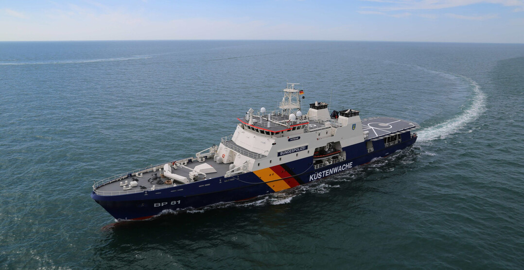 The vessels are armed with a BAE Systems Bofors 57mm Mk3 57mm main gun and two .50 caliber machine guns as secondary armament. Additionally, the stern features a flight deck capable of supporting the landing and take-off of the German Federal Police's Airbus Helicopters H215 Super Puma helicopter, along with internal space to accommodate five mission containers, indicating a versatile operational capability.
