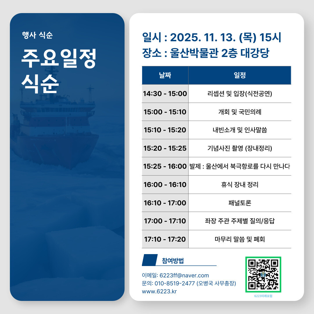 The 6223 Future Forum, which presents a vision for Ulsan's new leap forward, will host a symposium titled 'The Arctic Sea Route and the Future of Ulsan' at the Grand Auditorium of the Ulsan Museum on Wednesday, November 13, 2025, at 3:00 PM.