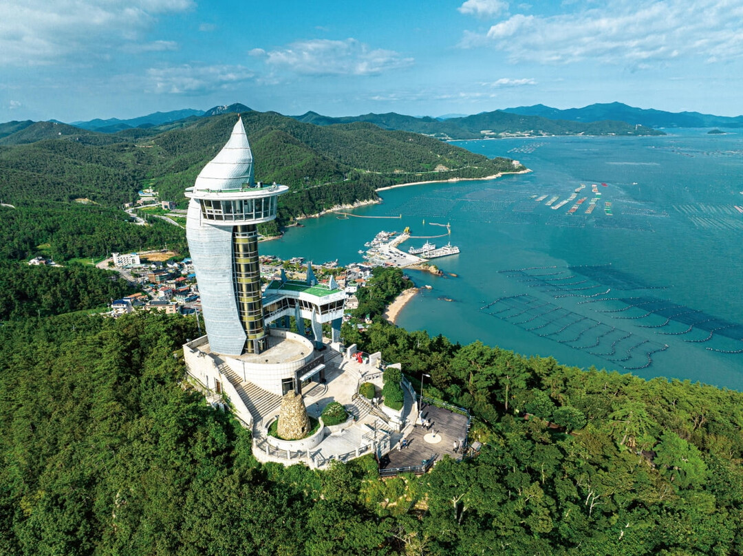 The Ttangkkeut Observatory, shaped like a nine-story torch, stands at the peak of Galdu Mountain, symbolizing hope and reunification. From the top, a dramatic 180-degree view showcases Galdu Port, the countless scattered islands, and the vast blue sea.